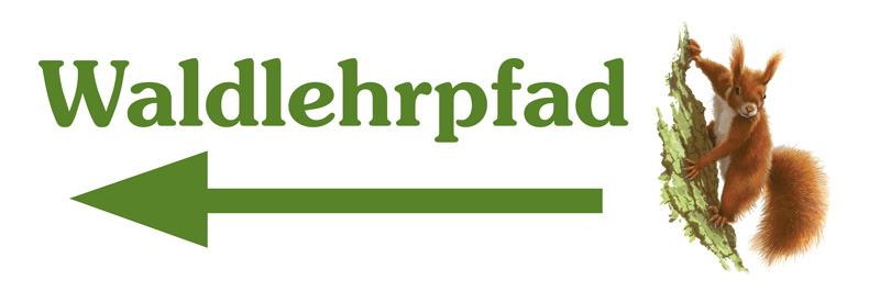 Auf einer Seite: Aufschrift Waldlehrpfad mit Pfeil nach links und die Abbildung eines Eichhörnchens.