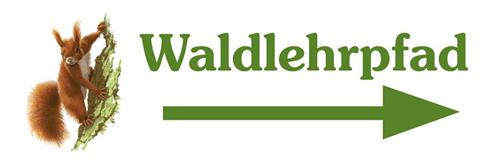 Auf einer Seite: Aufschrift Waldlehrpfad mit Pfeil nach rechts und die Abbildung eines Eichhörnchens.
